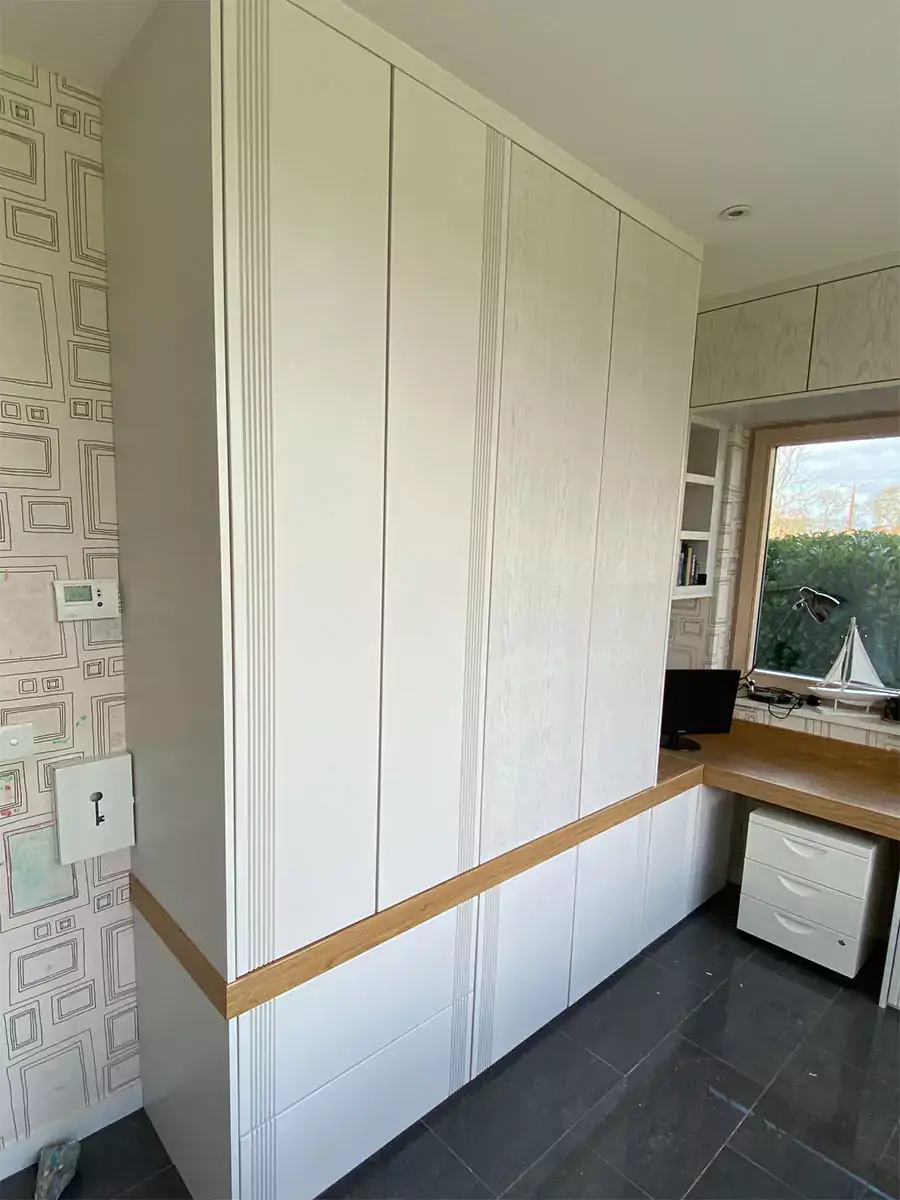 In this Kilkenny home transformation, our client needed more than just a desk—they required a complete, custom-built storage solution that would turn a bright, unused room into a luxury home office with functional bespoke home office furniture Kilkenny. With an emphasis on clean lines, natural light, and premium materials, this project is a great example of home study design in Kilkenny that’s both practical and elegant.